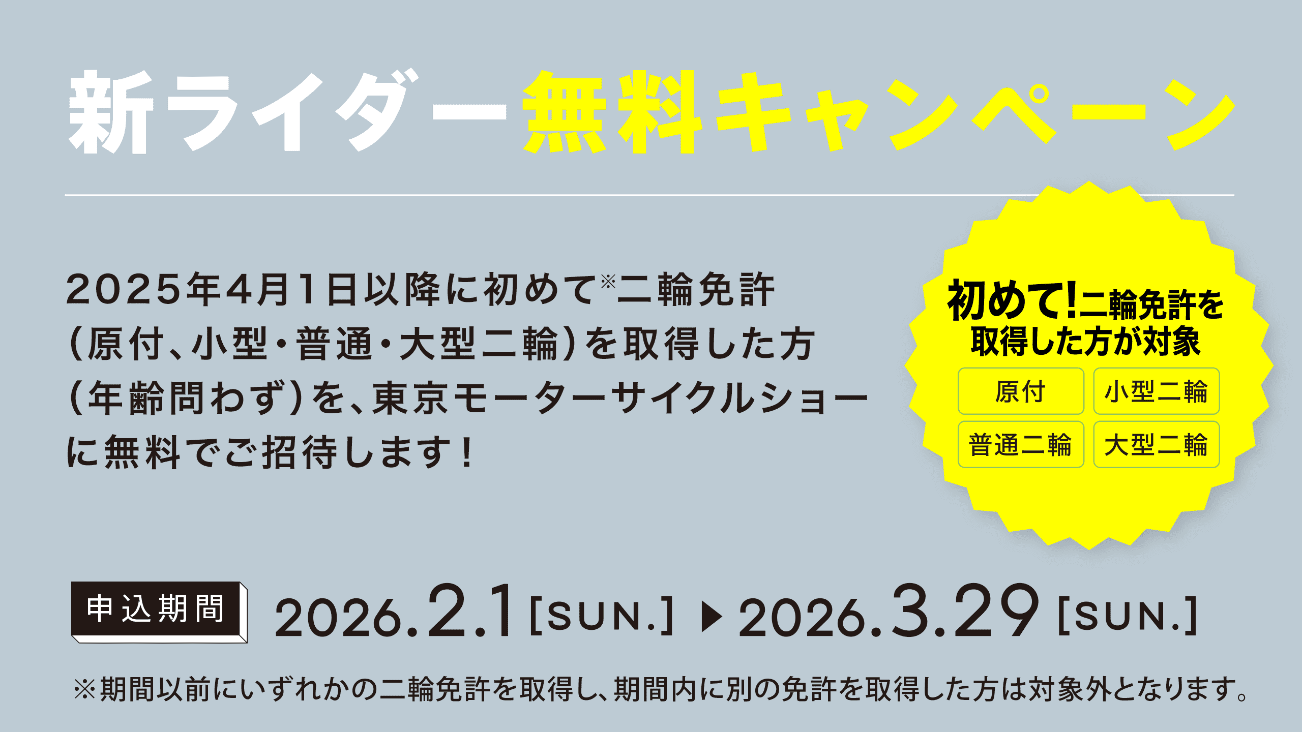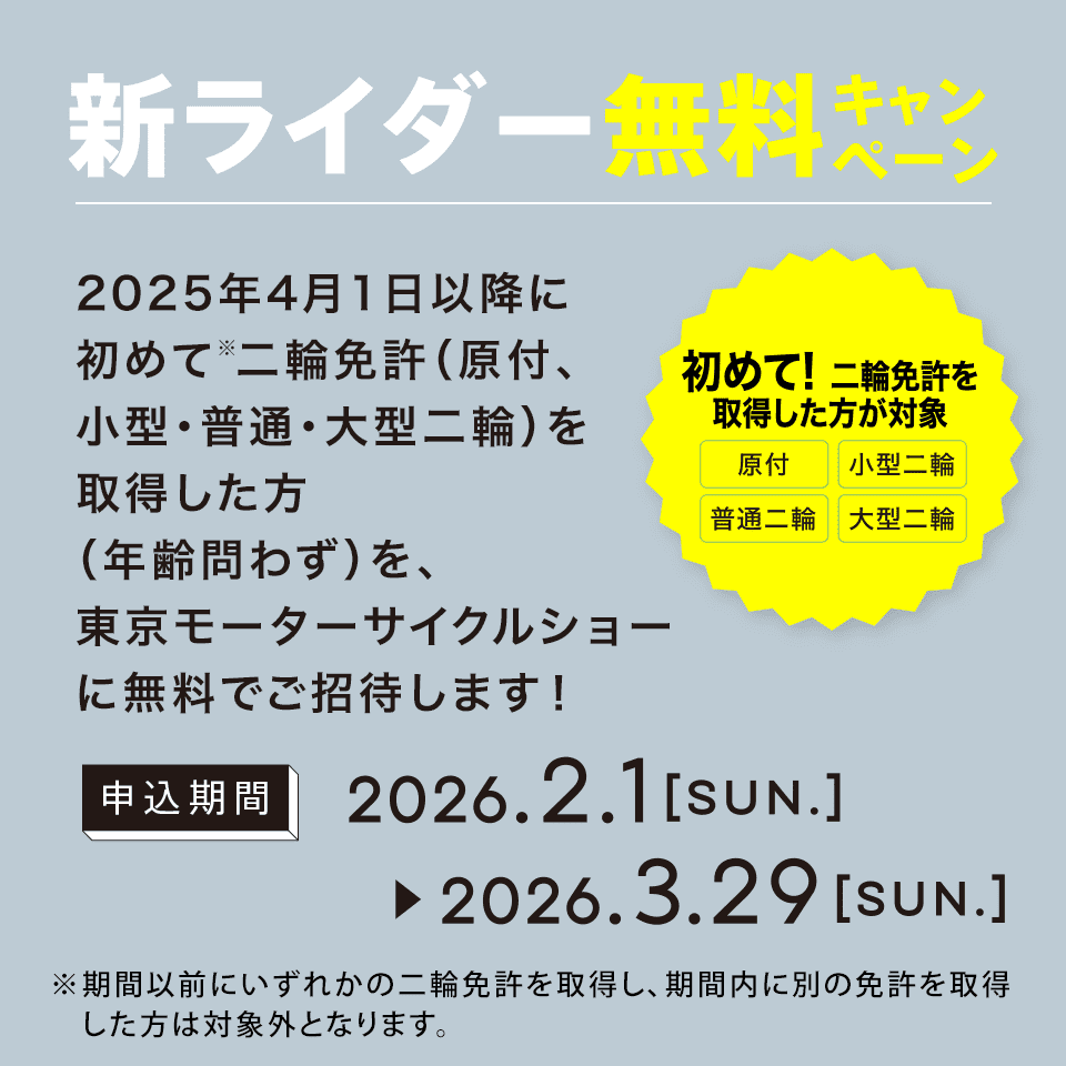 ※期間以前にいずれかの二輪免許を取得し、期間内に別の免許を取得した方は対象外となります。