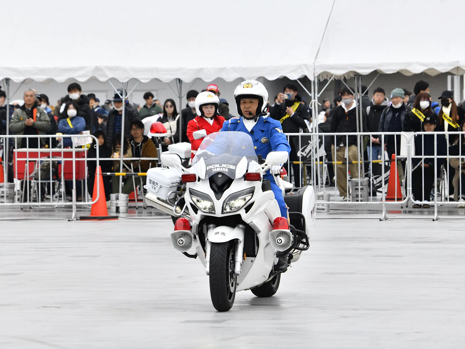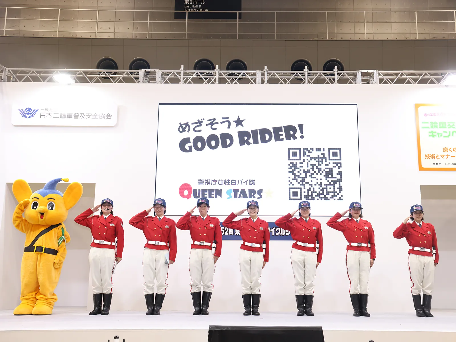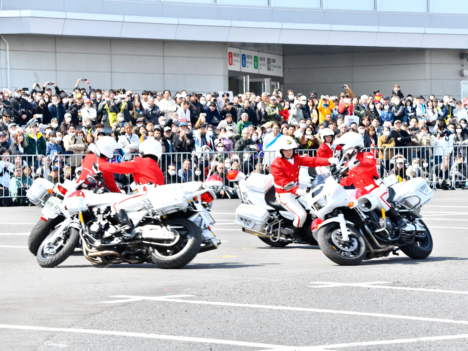 警視庁 ⼥性⽩バイ隊クイーンスターズとピーポ君による交通安全についてのステージを開催します。